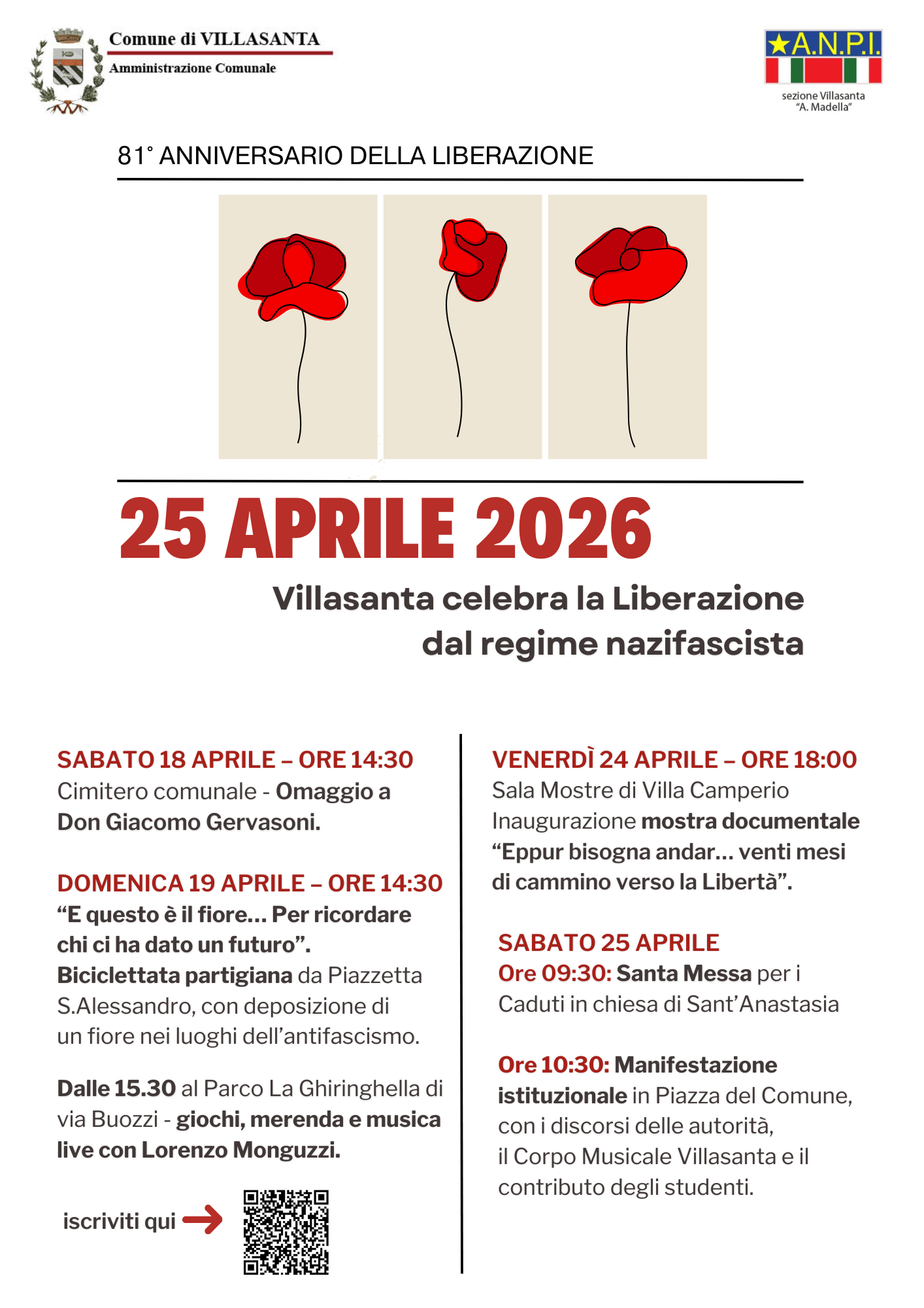E poi iniziative simboliche che commemorano figure e luoghi dell’antifascismo villasantese, un momento di festa comunitaria al parco La Ghiringhella e l’esibizione di Lorenzo Monguzzi, musicista noto anche per il suo ruolo nei "Mercanti di Liquore”.