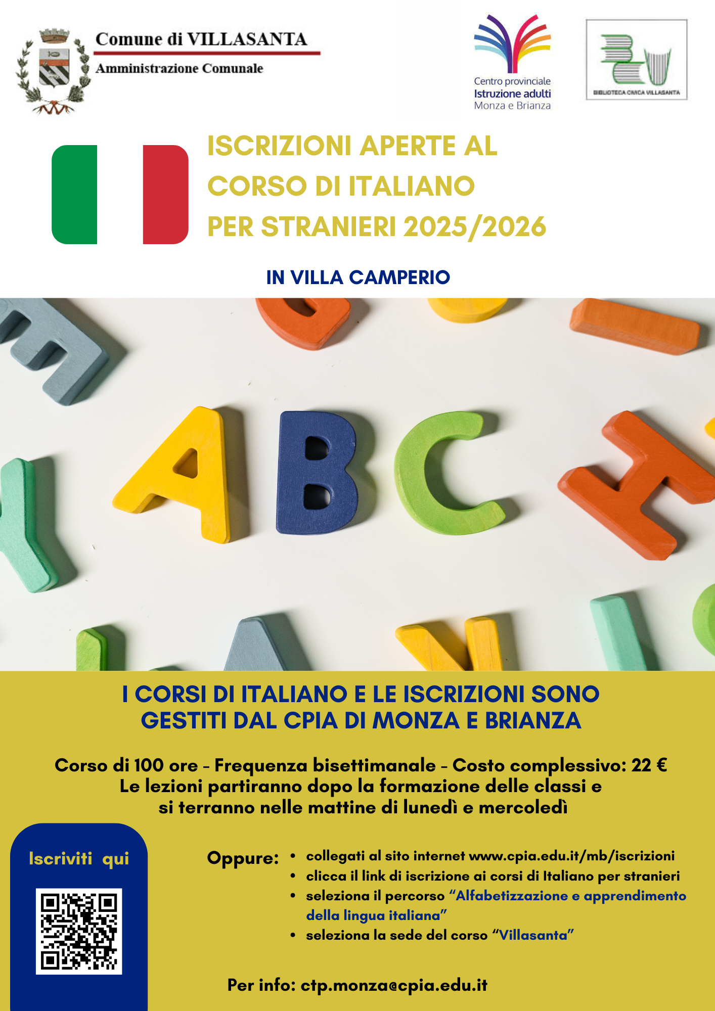 Mercoledì 29 ottobre 2025, dalle ore 9.30 alle ore 12.30, in Sala Mansarda di Villa Camperio (Piano 2), si terrà una mattina di accoglienza per iscrizioni e informazioni sul Corso di Italiano per stranieri promosso dal Comune.
