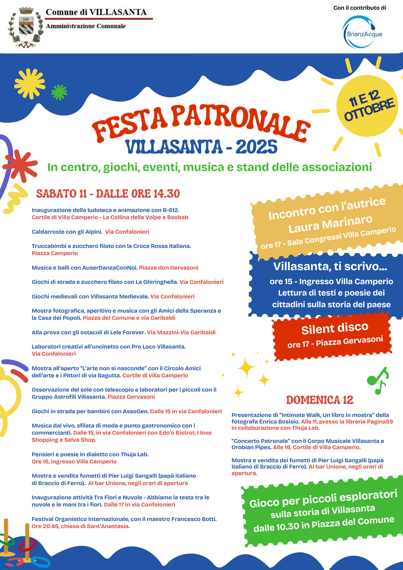 Villasanta 3 ottobre 2025. La Festa Patronale di Villasanta 2025 è alle porte: l’edizione 2025 ha un ricco programma di iniziative promosse per l’11 e 12 ottobre dall’Amministrazione comunale in collaborazione con numerose realtà cittadine.