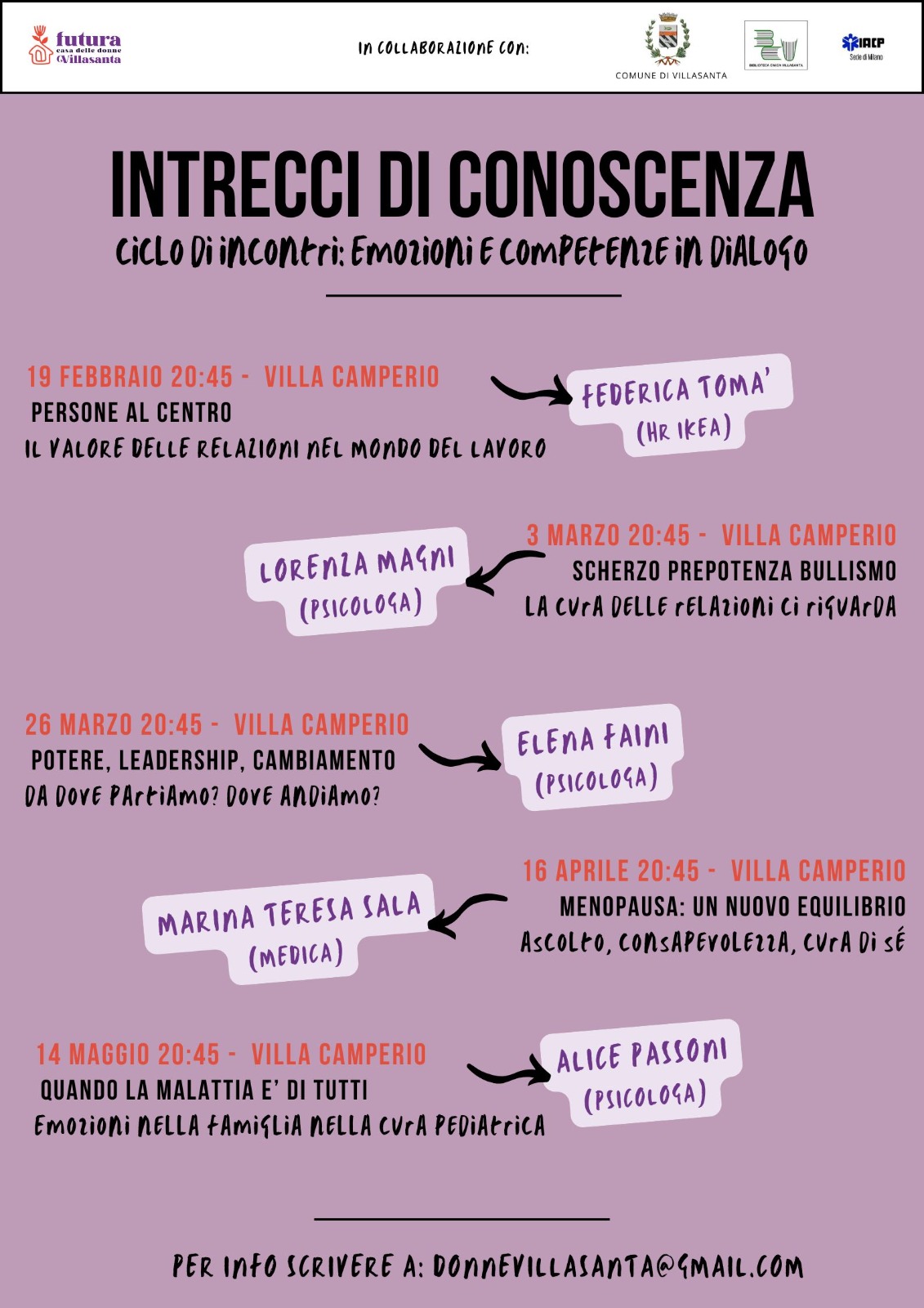 Prende il via a Villasanta la rassegna “Intrecci di Conoscenza – Emozioni e competenze in dialogo”, un ciclo di cinque incontri dedicati ai temi delle relazioni, del lavoro, della salute e della crescita personale. L’iniziativa è promossa da Futura – Casa delle Donne di Villasanta, in collaborazione con il Comune di Villasanta e la Biblioteca Civica A. Moro, e ogni appuntamento si terrà presso Villa Camperio alle ore 20.45.